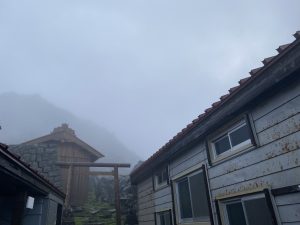 風が強く濡れガスに包まれた山頂