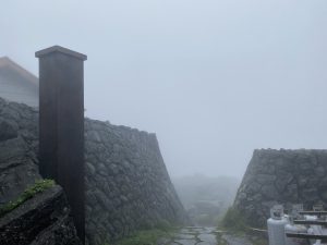 今日も1面ガスに包まれ時折雨が降っています。時折強い風が吹く山頂。